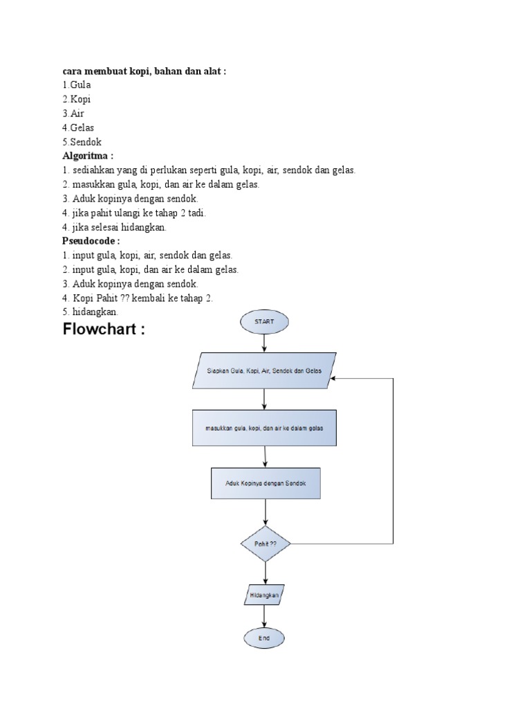 Setelah ini apakah anda tertarik untuk. Bahasa natural Deskriptif dan dengan cara diagram alir Flowchart. Buatlah algoritma membuat kopi yang rasa manis dan pahitnya pas menurut anda.