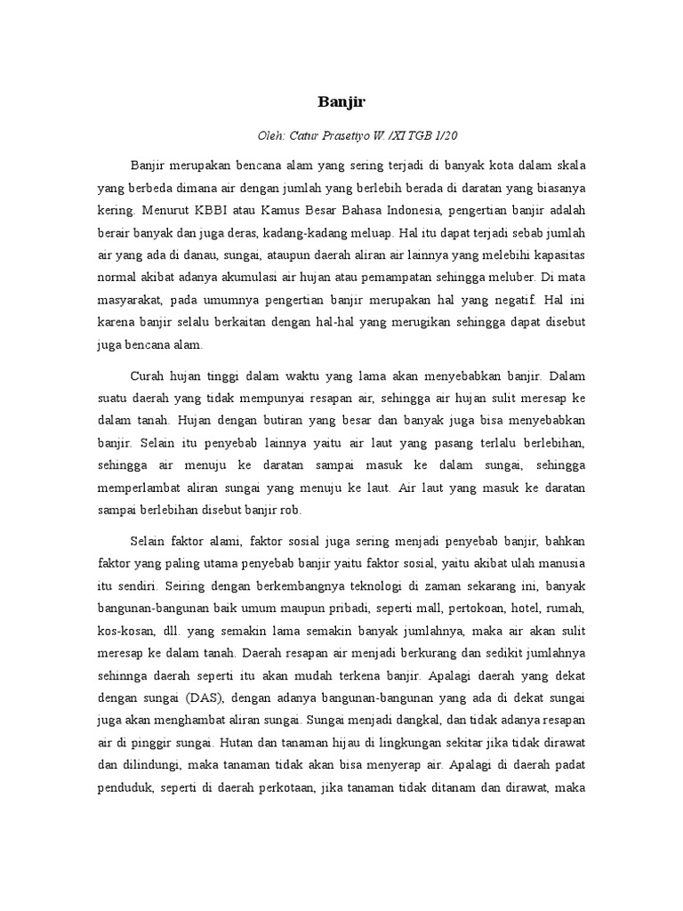 Agar saluran air sungai lancar serta tidak menimbulkan bencana banjir. Dalam pengertian yang luas banjir dapat diartikan sebagai suatu bagian dari siklus. Contoh Teks Eksplanasi tentang Banjir Singkat Berikut merupakan contoh teks eksplanasi tentang banjir singkat dan strukturnya yang akan memudahkan Anda dalam menjawab tugas dari guru Bahasa Indonesia.